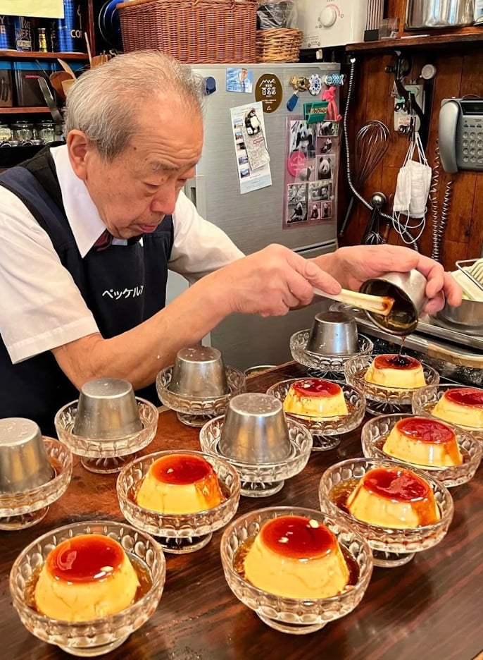 接下來就是傳說中的「布丁仙人」!「ヘッケルン Hekkelun」是默默飄香超過半世紀的老字號喫茶店,靠著一顆「神級手作布丁」直接圈粉無數!自從在社群平台上爆紅後,店門口天天上演排隊人龍,幾乎每個人來到這裡,都是鎖定招牌「手工布丁+現磨現煮咖啡」套餐,重點是只要 700 日圓就能享受這組夢幻組合,CP 值高到不行。綿密細緻的布丁一入口立刻化開,濃濃的雞蛋與牛奶香氣在嘴裡蔓延,再搭配甜度剛剛好的自製焦糖,層次感直接拉滿,配上一口順口熱咖啡簡直完美收尾!