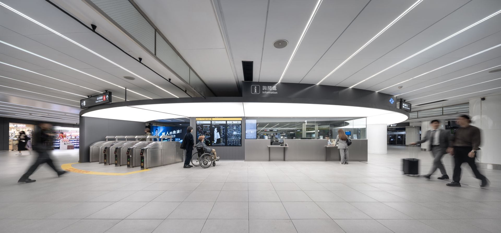 本次改造最具代表性的變革在於「圓弧服務盒」的導入。設計團隊採取「減法設計」策略,將原本散落各處的詢問處、售票機台、儲藏室及機電設備,統一整合在巨大的白色圓弧服務盒中。這座服務盒採取圓弧造型消解了原本粗壯柱體的突兀感,增加詢問處的行政效率與空間。純白的色彩計畫搭配水平橫向的帶狀燈光設計,大幅提升了地下空間的明亮度與通透感。原本因天花板低矮而造成的壓迫感,在重新調整照明與色彩後,轉化為具備現代感且有序的視覺場景。