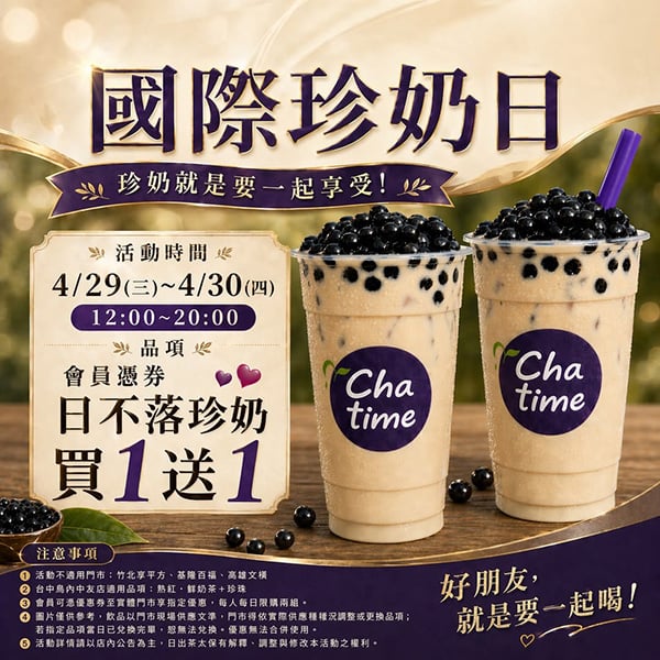 日出茶太本次活動將於 2026 年 4 月 29 日至 4 月 30 日 的 12:00 至 20:00 限時登場,日出茶太會員只需於實體門市出示優惠券,即可享有「日不落珍奶」買一送一 的超值優惠,每人每日限購 2 組。需特別注意的是,本活動不適用於竹北享平方、基隆百福及高雄文橫店,且台中中友店提供的活動品項為「熟紅.鮮奶茶加珍珠」,消費者前往兌換前請務必確認門市規範。