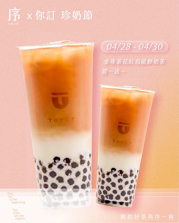 序序茶 TOPUP 現正推出指定鮮奶茶買一送一活動,即日起至 2026 年 4 月 30 日 為止,會員每日可於「你訂平台」領取一張大杯「金珠茶花紅烏龍鮮奶茶」買一送一優惠券。此優惠僅限來店兌換,且每人每日限領一張並須於當日使用完畢,需特別注意的是,LaLaport 門市恕不參與本次促銷活動。