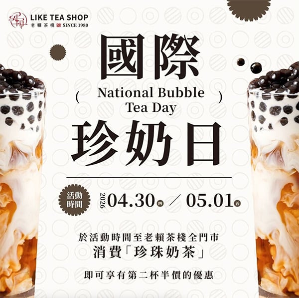 老賴茶棧將於 2026 年 4 月 30 日至 5 月 1 日 推出珍珠奶茶優惠活動,活動期間凡購買珍珠奶茶即可享有第二杯 5 折的半價折扣,需特別注意每人每次限購兩組,邀請大家在限時兩天的活動中與好友一同分享美味。